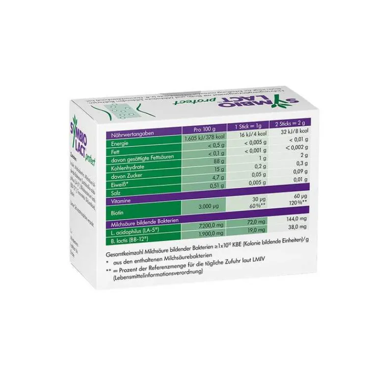 SymbioLact® protect enthält 30,0 µg Biotin pro Beutel. Biotin trägt zur Erhaltung normaler Schleimhäute, wie der Darmschleimhaut, bei. Zusätzlich enthält SymbioLact® protect zwei Stämme Milchsäure bildender Bakterien: