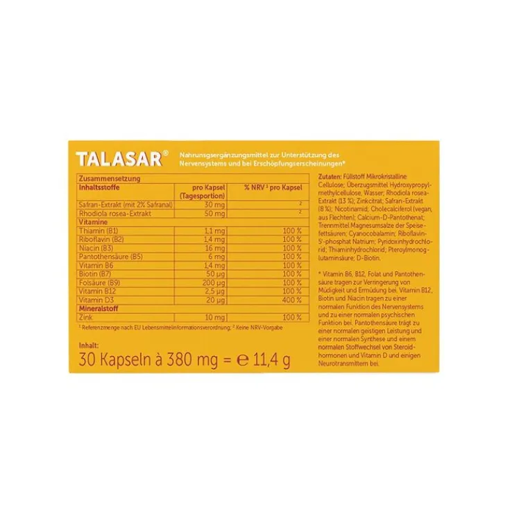 Vitamin B6, B12, Folat und Pantothensäure tragen zur Verringerung von Müdigkeit und Ermüdung bei. Vitamin B12, Biotin und Niacin tragen zu einer normalen Funktion des Nervensystems und zu einer normalen psychischen Funktion bei. Pantothensäure trägt zu einer normalen geistigen Leistung und einer normalen Synthese und einem normalen Stoffwechsel von Steroidhormonen und Vitamin D3 und einigen Neurotransmittern bei. Talasar ist ausgezeichnet verträglich.