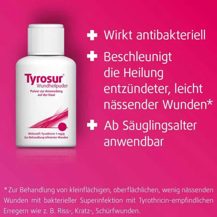 Tyrosur® Wundheilpuder Pulver zur Anwendung auf der Haut. Wirkstoff: Tyrothricin. Anwendungsgebiete: Zur (lindernden) Behandlung von kleinflächigen, oberflächlichen, wenig nässenden Wunden mit bakterieller Superinfektion mit Tyrothricin-empfindlichen Erregern wie z.B. Riss-, Kratz-, Schürfwunden. Zu Risiken und Nebenwirkungen lesen Sie die Packungsbeilage und fragen Sie Ihre Ärztin, Ihren Arzt oder in Ihrer Apotheke. Stand: März 2017. Engelhard Arzneimittel GmbH & Co. KG, 61138 Niederdorfelden.