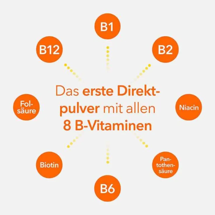 Von ratiopharm gibt es das erste Pulver mit allen acht B- Vitaminen: Vitamin B-Komplex-ratiopharm® direkt. Ein Beutel täglich reicht für die Versorgung mit allen acht B-Vitaminen aus – egal zu welcher Tageszeit und einfach ohne Wasser. Vitamin B-Komplex-ratiopharm® direkt schmeckt nach Pfirsich und ist frei von Laktose, Gluten, Zucker, Gelatine und sonstigen tierischen Inhaltsstoffen und ist somit auch für die vegetarische Ernährung geeignet.