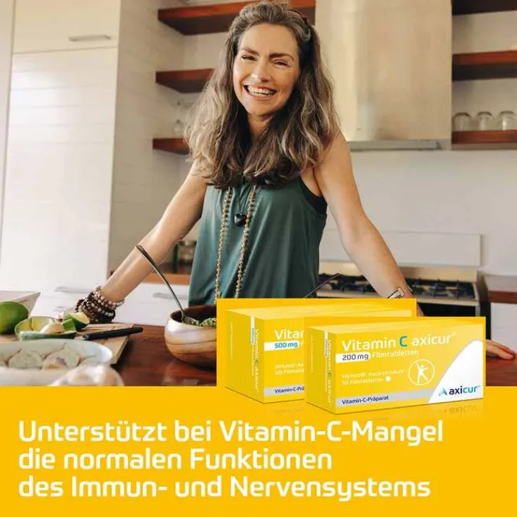 Vitamin C axicur® 500 mg Filmtabletten Wirkstoff: Ascorbinsäure. Anwendungsgebiete: Vitamin-C-Präparat zur Behandlung von Vitamin-C-Mangel-Krankheiten. Zur Behandlung zur Verhinderung von Rückfällen bei Cystin-Harnsteinleiden in Kombination mit Harnalkalisierungsmaßnahmen. Enthält Lactose. Packungsbeilage beachten. Zu Risiken und Nebenwirkungen lesen Sie die Packungsbeilage und fragen Sie Ihre Ärztin, Ihren Arzt oder in Ihrer Apotheke. axicorp Pharma GmbH, 61381 Friedrichsdorf. Stand: April 2022