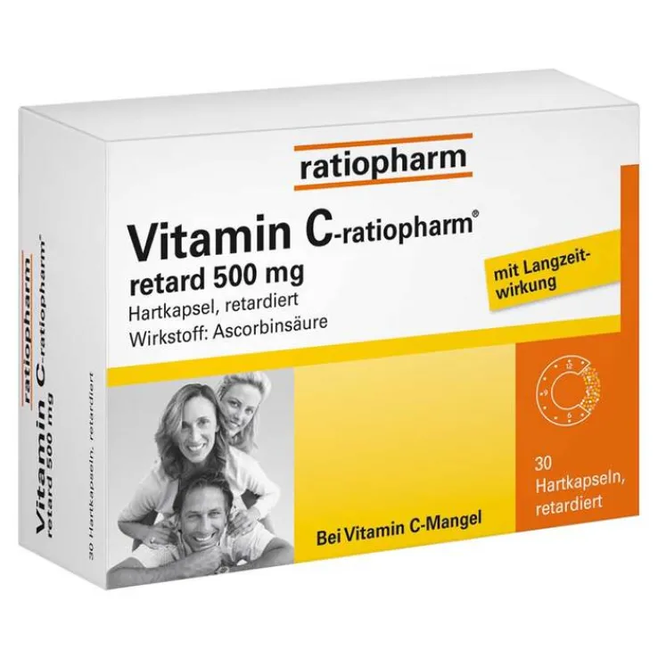 Vitamin C-ratiopharm® retard 500 mg. Wirkstoff: Ascorbinsäure. Anwendungsgebiete: Therapie von Vitamin-C-Mangelkrankheiten. Warnhinweis: Arzneimittel enth ält Saccharose. Freiverkäuflich. Zu Risiken und Nebenwirkungen lesen Sie die Packungsbeilage und fragen Sie Ihre Ärztin, Ihren Arzt oder in Ihrer Apotheke. 4/23.
