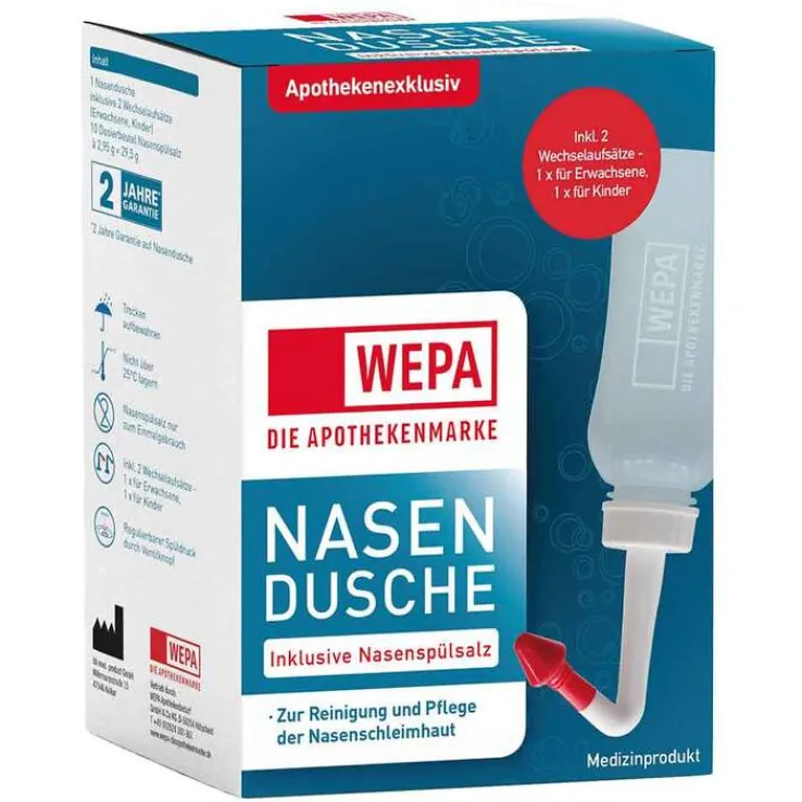 Die Nasendusche ist ein Medizinprodukt, welche als Applikationshilfe zur Spülung der Nasenhöhle mit einer Nasenspülsalzlösung eingesetzt wird. Durch die Spülung werden die Nasenschleimhaut und die Nasenhöhle gereinigt.