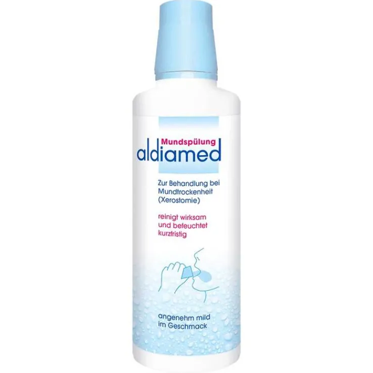 Aldiamed Mundspülung, zur Behandlung bei Mundtrockenheit, reinigt wirksam und befeuchtet kurzfristig. Die Mundspülung unterstützt den natürlichen Schutz in der Mundhöhle.