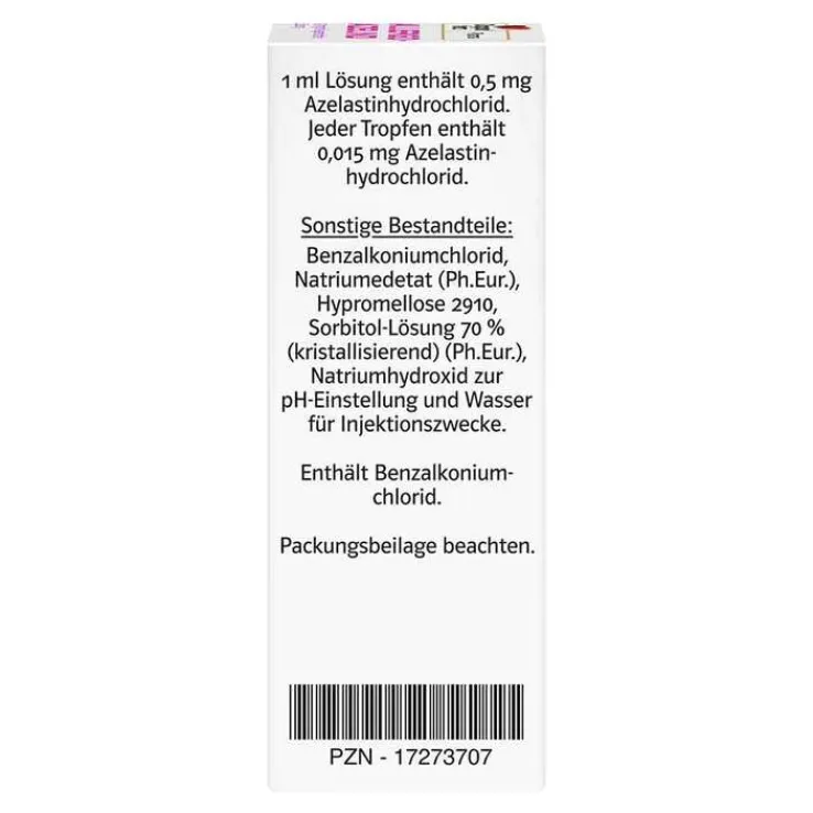 ALLERGO-AZELIND 0,5 mg/ml Augentropfen, Lösung. Wirkstoff: Azelastinhydrochlorid. Anwendungsgebiet: Zur Behandlung und Vorbeugung von durch Heuschnupfen bedingten Beschwerden am Auge (saisonale allerg. Konjunktivitis) bei Erw., Jugendl. und Kindr. ab 4 Jahren. Zur Behandlung von durch Allergien auf Substanzen wie z. B. Hausstaubmilben und Tierhaare bedingten Beschwerden am Auge (perenniale allerg. Konjunktivitis) bei Erw. und Jugendl. ab 12 J. Warnhinweise: Enthält Benzalkoniumchlorid. Zu Risiken und Nebenwirkungen lesen Sie die Packungsbeilage und fragen Sie Ihre Ärztin, Ihren Arzt oder in Ihrer Apotheke. Stand 04/2021