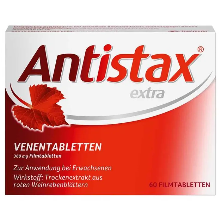 Antistax® extra Venentabletten. 360 mg Filmtabletten Zur Anwendung bei Erwachsenen Wirkstoff: Trockenextrakt aus roten Weinrebenblättern. Zur Behandlung von Beschwerden bei Erkrankungen der Beinvenen (chronische Veneninsuffizienz), die sich zum Beispiel durch Schmerzen und Schweregefühl in den Beinen, Krampfadern, nächtliche Wadenkrämpfe, Juckreiz und geschwollene Beine (Beinödeme) äußern. Zu Risiken und Nebenwirkungen lesen Sie die Packungsbeilage und fragen Sie Ihre Ärztin, Ihren Arzt oder in Ihrer Apotheke. STADA Consumer Health Deutschland GmbH, Stadastraße 2–18, 61118 Bad Vilbel Stand: Oktober 2023