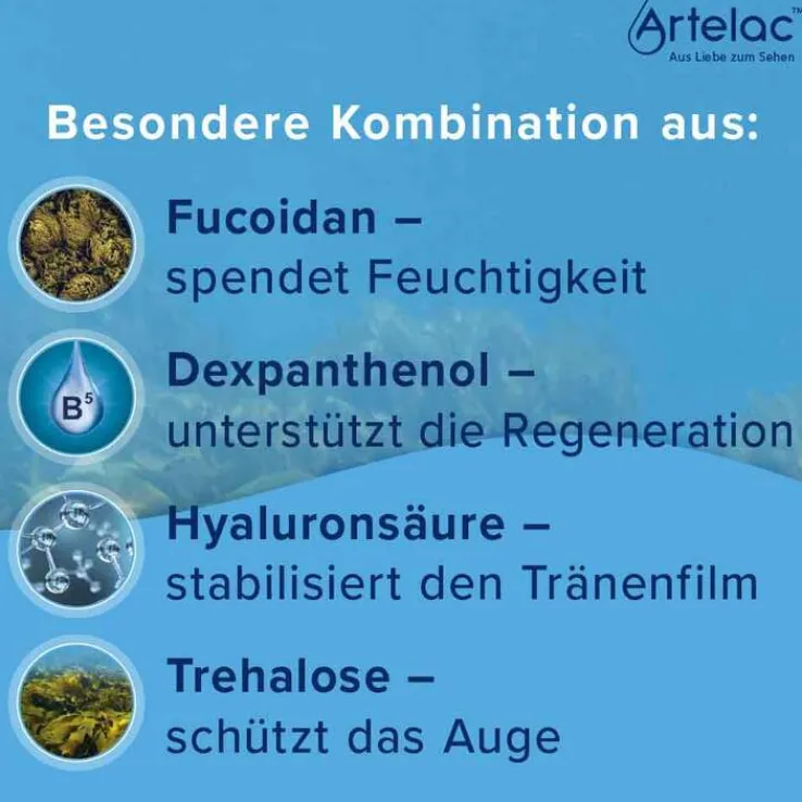 Artelac® Augenschutzengel MDO® Augentropfen sind speziell auf die Bedürfnisse Ihrer Augengesundheit abgestimmt und bieten eine regenerierende und schützende Lösung bei verletzten und geschädigten Augenober- flächen. Die Augentropfen vereinen vier wertvolle Inhaltstoffe: Dexpanthenol mit heilungsfördernden Eigenschaften, Hyaluronsäure zur Stabilisierung des Tränenfilms, Trehalose zum Schutz vor Austrocknung und Fucoidan – ein natürlicher Inhaltsstoff aus Braunalgen, der feuchtigkeitsspendende und entzündungshemmende Eigenschaften besitzt.