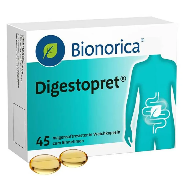 Digestopret® lindert mithilfe von hochdosiertem Pfefferminzöl auf natürliche Weise wiederkehrende Darmprobleme, die bspw. bei Personen mit Reizdarmsyndrom auftreten können. Es reduziert den Calciumeinstrom, entspannt so die Darmmuskulatur und lindert Schmerzen; es wirkt entschäumend und löst dadurch Blähungen; außerdem kann es durch die Anregung der Gallenproduktion die Verdauung unterstützen und Völlegefühl reduzieren. Eine Weichkapsel entspricht etwa 70 Tassen Pfefferminztee. Die magensaftresistenten Weichkapseln sind gut verträglich, da sie die Magenschleimhaut schonen, und sorgen dafür, dass das Pfefferminzöl direkt im Darm wirkt. Patienten berichteten von einer Symptomlinderung innerhalb von 1 bis 4 Stunden nach der Einnahme des Wirkstoffs.***