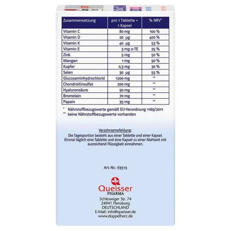 - Nahrungsergänzungsmittel mit Vitaminen, Spurenelementen, Glucosaminhydrochlorid, Chondroitinsulfat, Hyaluronsäure, Bromelain und Papain