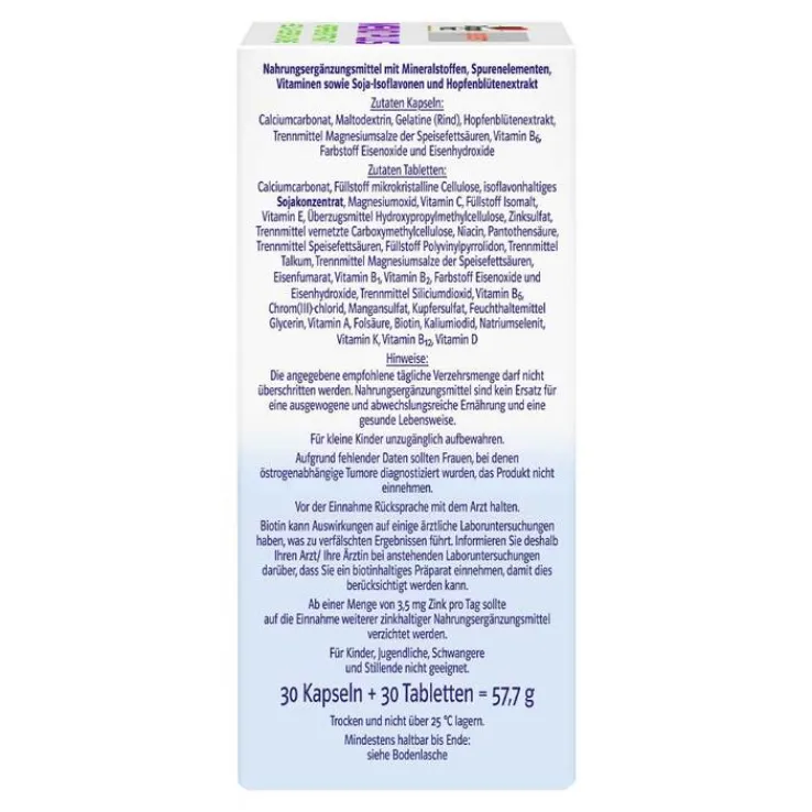 Zutaten Kapseln: Calciumcarbonat, Maltodextrin, Gelatine (Rind), Hopfenblütenextrakt, Trennmittel Magnesiumsalze der Speisefettsäuren, Vitamin B6, Farbstoff Eisenoxide und Eisenhydroxide.Zutaten Tabletten: Calciumcarbonat, Füllstoff mikrokristalline Cellulose, isoflavonhaltiges SOJAKONZENTRAT, Magnesiumoxid, Vitamin C, Füllstoff Isomalt, Vitamin E, Überzugsmittel Hydroxypropylmethylcellulose, Zinksulfat, Trennmittel vernetzte Carboxymethylcellulose, Niacin, Pantothensäure, Trennmittel Speisefettsäuren, Füllstoff Polyvinylpyrrolidon, Trennmittel Talkum, Trennmittel Magnesiumsalze der Speisefettsäuren, Eisenfumarat, Vitamin B1, Vitamin B2, Farbstoff Eisenoxide und Eisenhydroxide, Trennmittel Siliciumdioxid, Vitamin B6, Chrom(III)-chlorid, Mangansulfat, Kupfersulfat, Feuchthaltemittel Glycerin, Vitamin A, Folsäure, Biotin, Kaliumiodid, Natriumselenit, Vitamin K, Vitamin B12, Vitamin D.