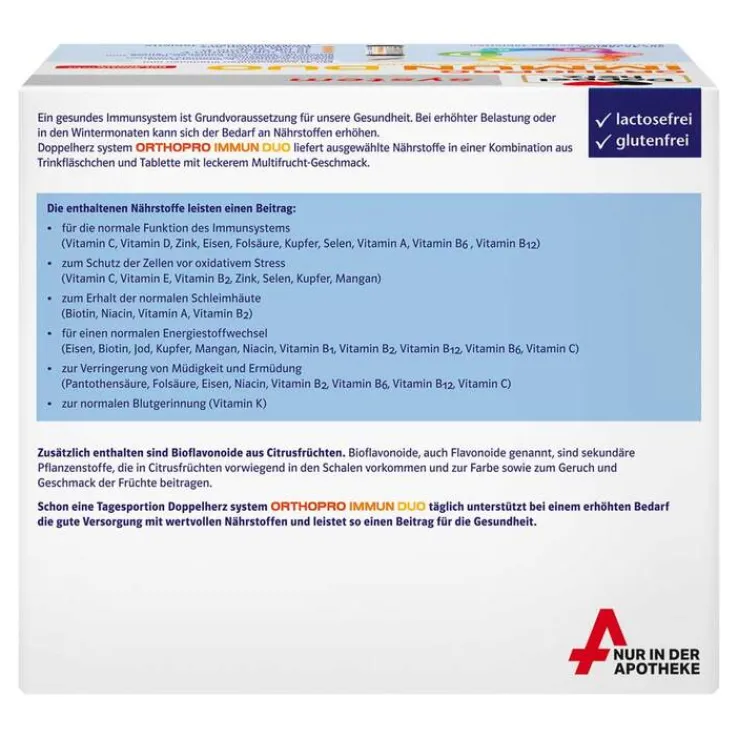 Ein gesundes Immunsystem ist Grundvoraussetzung für unsere Gesundheit. Bei erhöhter Belastung oder in den Wintermonaten kann sich der Bedarf an Nährstoffen erhöhen. Doppelherz system Orthopro Immun Duo liefert ausgewählte Nährstoffe in einer Kombination aus Trinkfläschchen und Tablette mit Multifrucht-Geschmack.