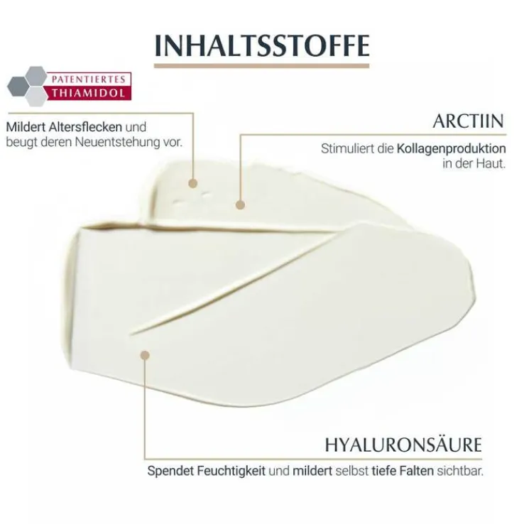 Der in der Anti Aging Hautpflegecreme enthaltene Anti-Pigment-Pflegewirkstoff Thiamidol® wirkt aktiv gegen Hyperpigmentierungen wie Altersflecken. Durch eine Reduktion der Melaninproduktion lässt Thiamidol® bestehende Altersflecken verblassen und hindert neue an ihrer Entstehung.