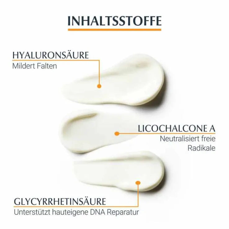 Damit die hauteigene DNA-Reparatur unterstützt wird, enthält die Sonnenschutzcreme Glycyrrhetinsäure. Außerdem ist ihre Formel mit kurz- sowie langkettiger Hyaluronsäure angereichert und vermindert somit Falten im Gesicht und Dekollete sichtbar.