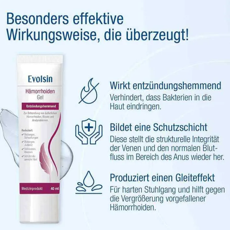 Evolsin® Hämorrhoiden Gel ist ein Medizinprodukt für die Behandlung von äußerlichen Hämorrhoiden und anderer kleinerer anorektaler Erkrankungen wie Analjucken und Fissuren. Evolsin® Hämorrhoiden Gel reduziert Reizungen, Schwellungen, Jucken, Schmerz und Brennen und verhindert den Kontakt der gereizten Haut mit Reizflüssigkeiten oder Stuhl aus dem Rektum.
