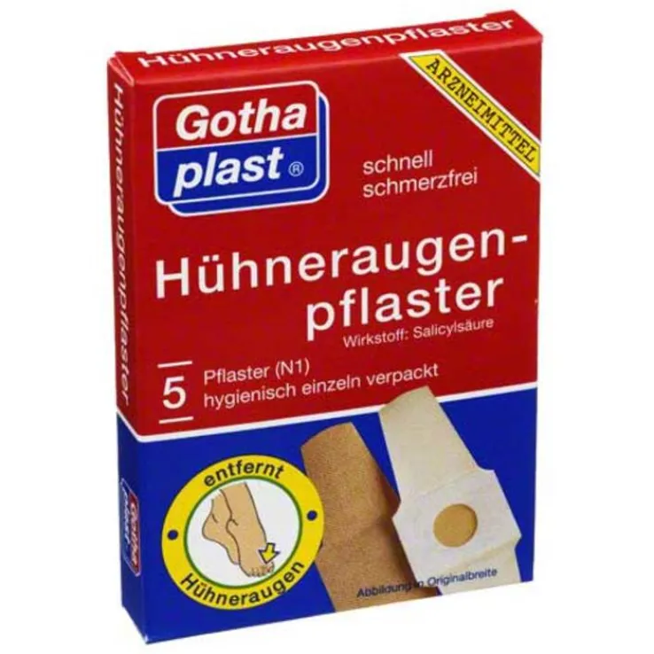 Gothaplast® Hühneraugenpflaster. Wirkstoff: Salicylsäure. Anwendungsgebiete: Zur Entfernung von Hühneraugen (Clavus) oder Hornhautschwielen (Hyperkeratosen). Warnhinweise: enthält Kautschuk und Wollwachs. Zu Risiken und Nebenwirkungen lesen Sie die Packungsbeilage und fragen Sie Ihre Ärztin, Ihren Arzt oder in Ihrer Apotheke. Gothaplast GmbH