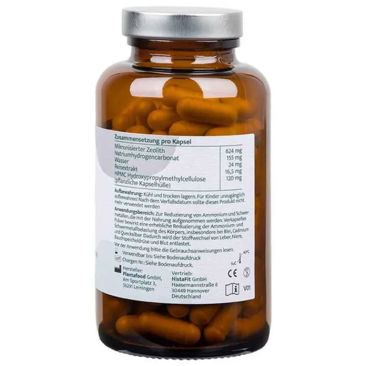 Mikronisierter Zeolith, Natriumhydrogencarbonat, Wasser, Reisextrakt, HPMC Hydroxypropylmethylcellulose (pflanzliche Kapselhülle)