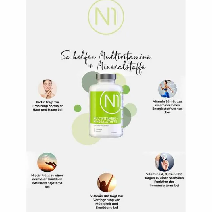 Die in N1 Multivitamine + Mineralstoffe enthaltenen Inhaltsstoffe tragen auf vielfältige Art und Weise dazu bei, unseren Körper auch in schweren oder belastenden Zeiten in Normalform zu halten.* Die Tabletten sind vegetarisch, gluten- und laktosefrei und ohne unnötige Zusatzstoffe wie z.B. Titandioxid (Lebensmittelfarbstoff).
