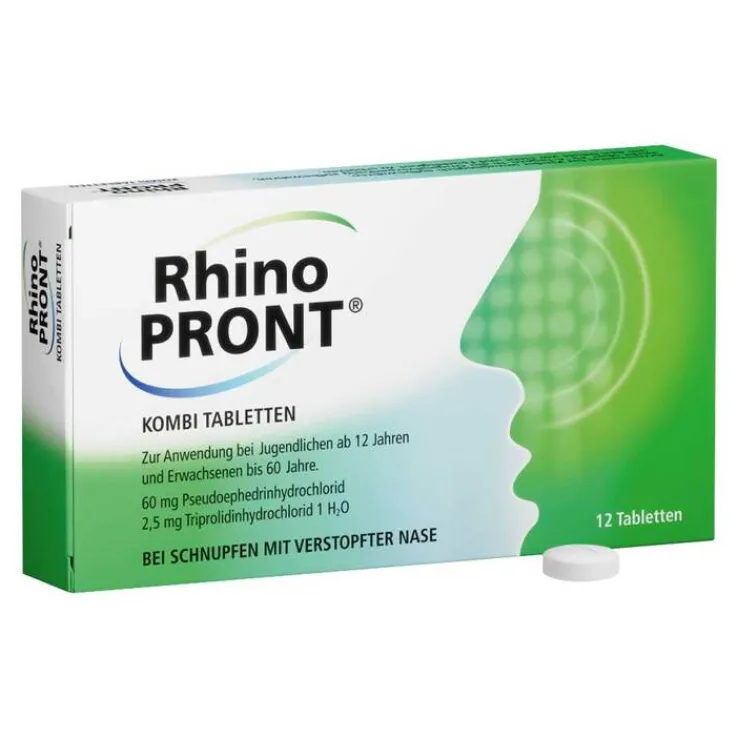 RhinoPRONT® Kombi Tabletten. Wirkstoffe: Pseudoephedrin-HCl, Triprolidin-HCl 1 H2O. Anwendungsgebiet: Symptomatische Behandlung der akuten, allergischen oder vasomotorischen Rhinitis, wenn sie mit einer Verstopfung der Nase einhergeht. Zur Anwendung bei Jugendlichen ab 12 Jahren und Erwachsenen bis 60 Jahre. Warnhinweis: Enthält Lactose. Packungsbeilage beachten. Apothekenpflichtig. Stand: Juli 2020. Pharmazeut. Unternehmer: Recordati Pharma GmbH, 89075 Ulm. Zu Risiken und Nebenwirkungen lesen Sie die Packungsbeilage und fragen Sie Ihre Ärztin, Ihren Arzt oder in Ihrer Apotheke.