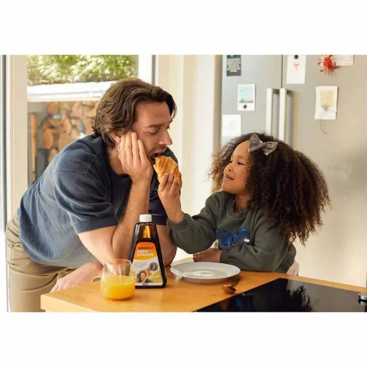 Zucker, Wasser, Glucosesirup, Orangensaftkonzentrat, Malzextrakt (aus GERSTE), Vitamin C, Grapefruitsaftkonzentrat, Säuerungsmittel Citronensäure, Verdickungsmittel Xanthan, Orangenöl, Sonnenblumenöl, Konservierungsstoff Natriumbenzoat, Niacin, Pantothensäure, Vitamin E, Emulgator Polysorbat 80, Vitamin B2, Vitamin B1, Vitamin B6, Vitamin A, Vitamin D.