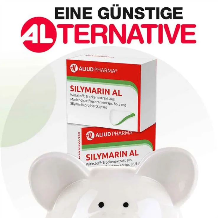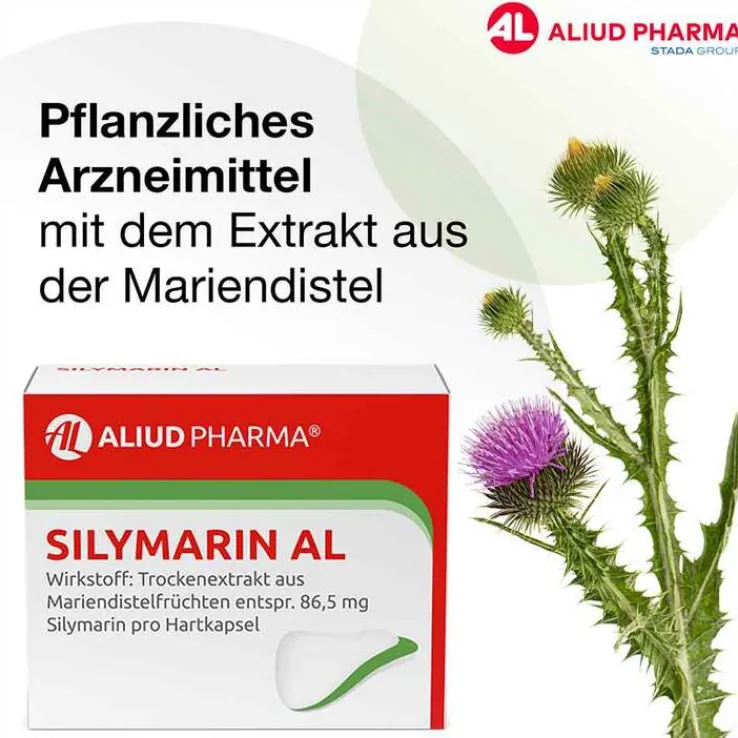 SILYMARIN AL Wirkstoff: Trockenextrakt aus Mariendistelfrüchten. Zur unterstützenden Behandlung bei chronisch-entzündlichen Lebererkrankungen, Leberzirrhose und toxischen (durch Lebergifte verursachten) Leberschäden. Hinweis: Enthält Lactose. Zu Risiken und Nebenwirkungen lesen Sie die Packungsbeilage und fragen Sie Ihre Ärztin, Ihren Arzt oder in Ihrer Apotheke. ALIUD PHARMA GmbH, Postfach 1380, 89146 Laichingen Stand: August 2013