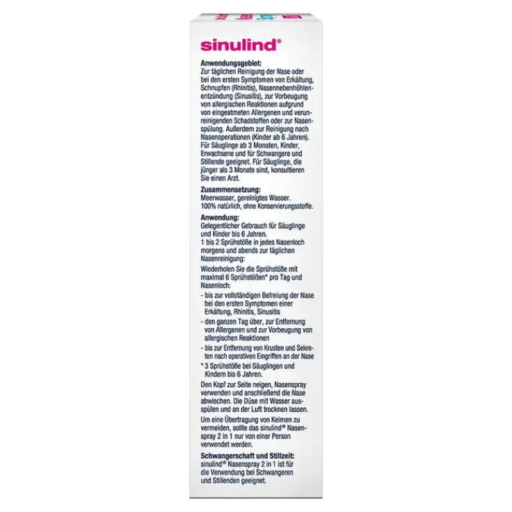 Außerdem zur Reinigung nach Nasenoperationen (Kinder ab 6 Jahren). Für Säuglinge ab 3 Monaten, Kinder, Erwachsene und für Schwangere und Stillende geeignet.