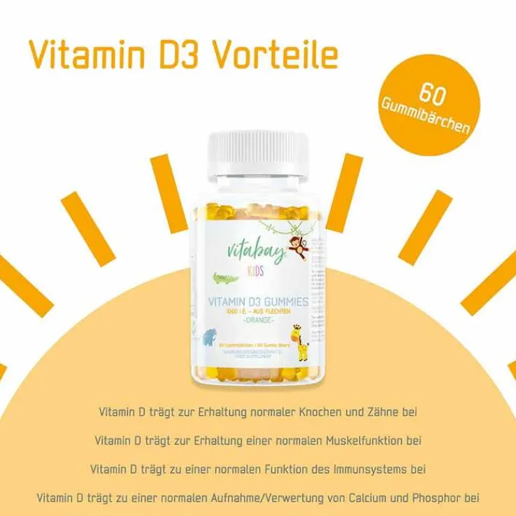 Vitamin D trägt zu einer normalen Funktion des Immunsystems bei. Vitamin D trägt zur Erhaltung normaler Knochen bei. Vitamin D trägt zur Erhaltung normaler Zähne bei. Vitamin D trägt zur Erhaltung einer normalen Muskelfunktion bei. Vitamin D trägt zu einer normalen Aufnahme/Verwertung von Calcium und Phosphor bei. Vitamin D trägt zu einem normalen Calciumspiegel im Blut bei. Vitamin D hat eine Funktion bei der Zellteilung.